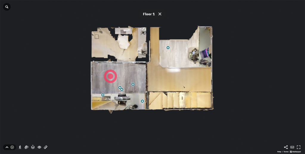 The Floorplan View provides a clean, top-down perspective of your space, just like a traditional blueprint. As such, it’s ideal for understanding room sizes, flow, and layout—making it easier for clients to plan, navigate, and visualize the entire property.
